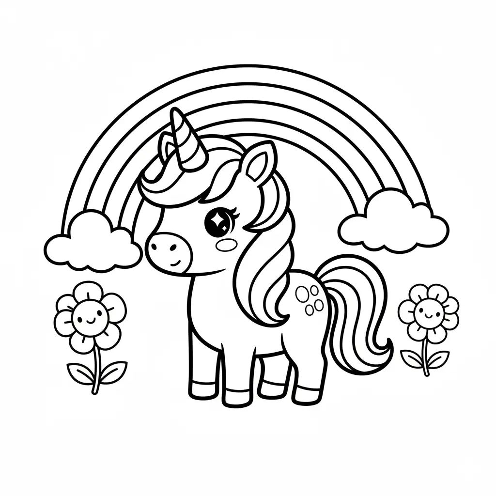 Prompt:kawaii coloring page of a unicorn with a rainbow, thick lines, simple background, no shading