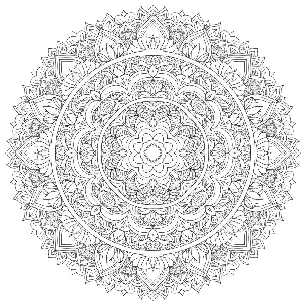 | Mindfulness | Adults | Complex mandala pattern with roses and leaves, mindfulness coloring page, high detail, intricate patterns | mandala, intricate patterns |